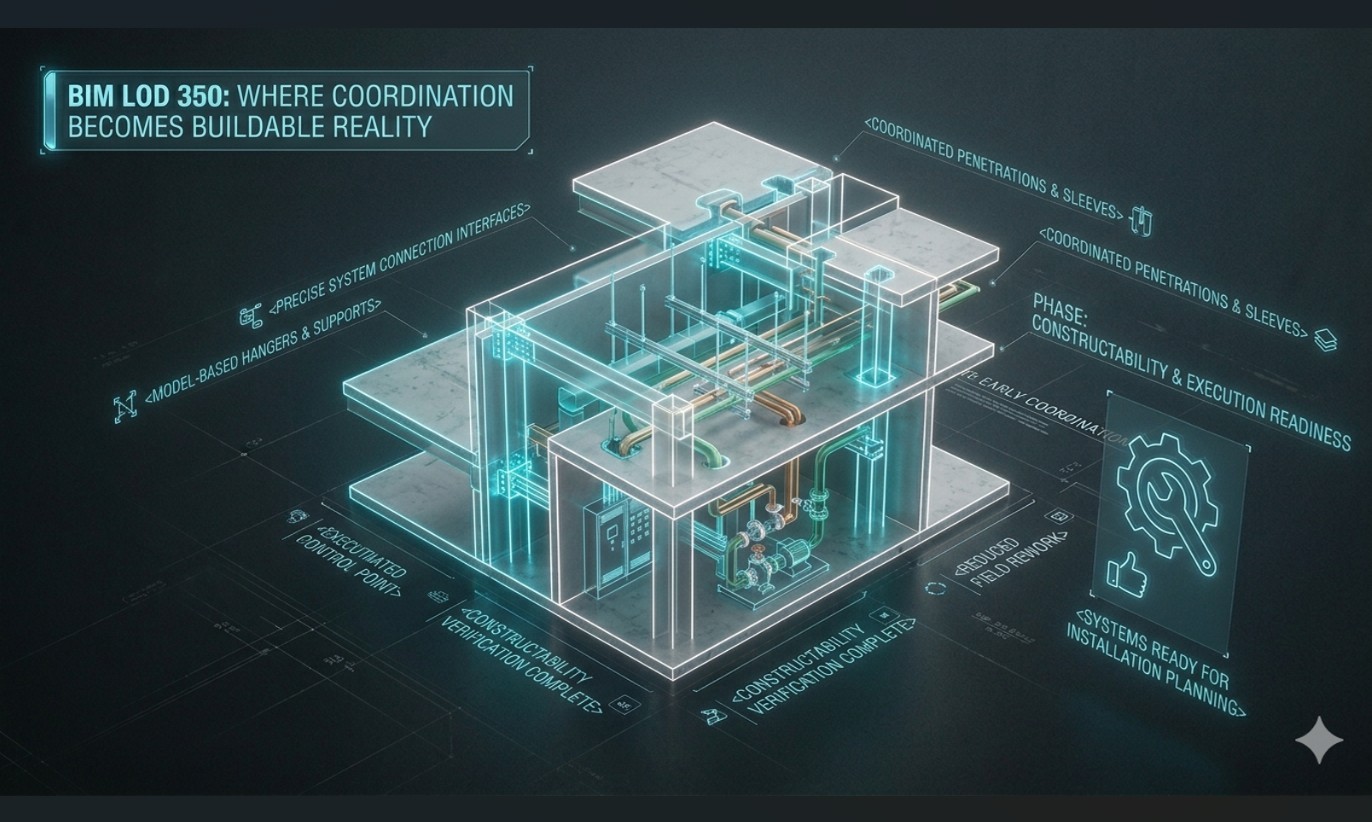 In BIM, moving from coordination to constructability is where real project value begins. LOD 350 sits exactly at that transition point, where models don’t just show systems, but how they actually connect and interact.