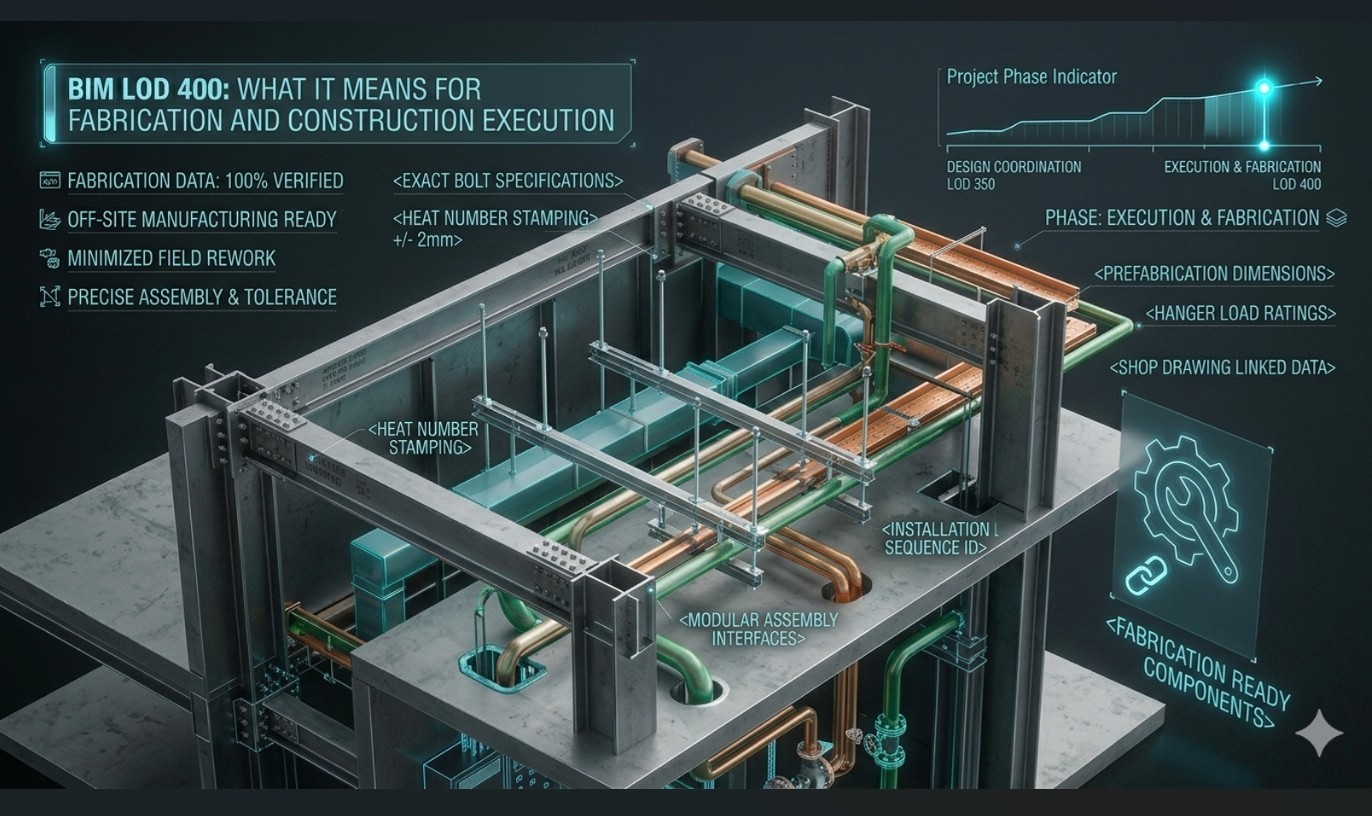 As projects move from coordination into execution, the level of detail required in BIM models increases significantly. LOD 400 represents this shift, where models are no longer just coordinated, but ready for fabrication and installation.