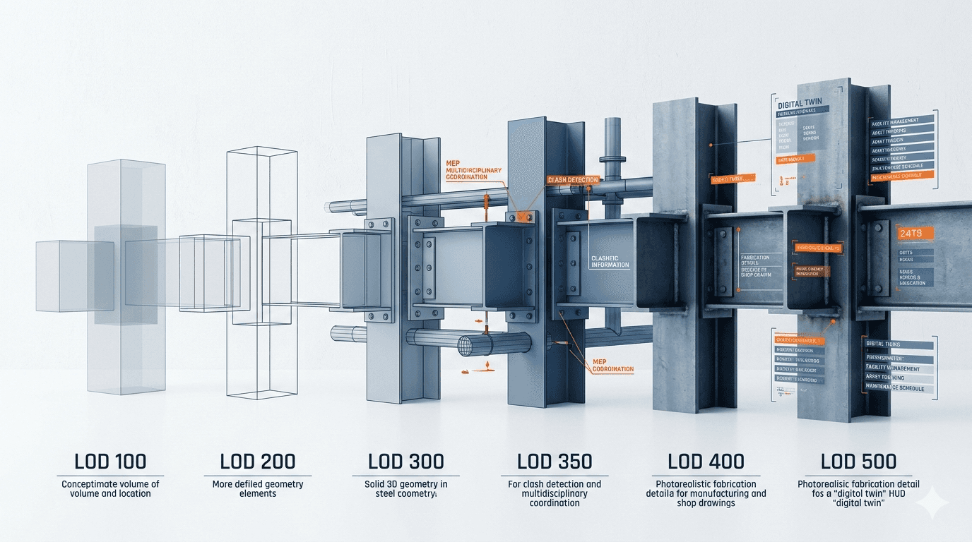 Industry standards commonly reference LOD 100 through LOD 500: